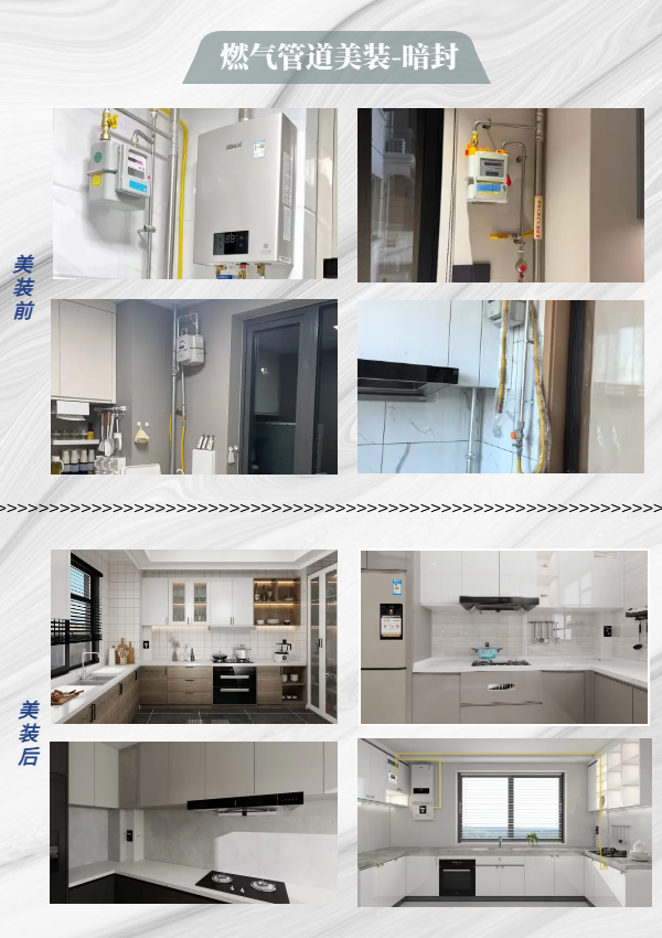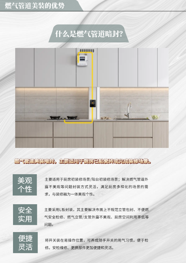 主要解决燃气管道外露不美观等场景,有效解决主立管外露,让燃气管道能够完美隐藏起来。